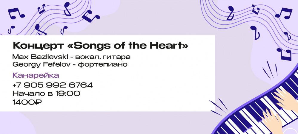 Songs of the Heart — это вечер живой музыки, где всё звучит от сердца. Max Bazilevski и Георгий Фефелов приглашают вас в атмосферу тёплого, камерного звучания, где голос и клавиши соединяются в искренний разговор о любви, времени и чувствах. В программе — песни, в которых живёт романтика, нежность и сила человеческих эмоций. 27 ноября 2025г., начало в 19:00, цена билета 1400р.