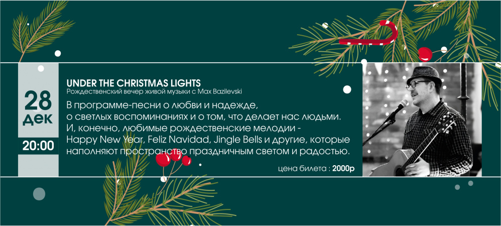 Рождественский вечер живой музыки с Max Bazilevski Под мягким светом зимних огней рождается особое настроение — то, что бывает только в декабре. Когда хочется тепла, искренности и живого человеческого голоса. Голос Макса — бархатный, глубокий и полный эмоций. Он звучит честно и просто, как будто поёт прямо для тебя. А тёплая гитара делает этот вечер камерным и по-настоящему уютным. В программе — песни о любви и надежде, о светлых воспоминаниях и о том, что делает нас людьми. И, конечно, любимые рождественские мелодии — Happy New Year, Feliz Navidad, Jingle Bells и другие, которые наполняют пространство праздничным светом и радостью. 28.12.2025 в 20:00, цена билета - 2000р., караоке-клуб "Канарейка".