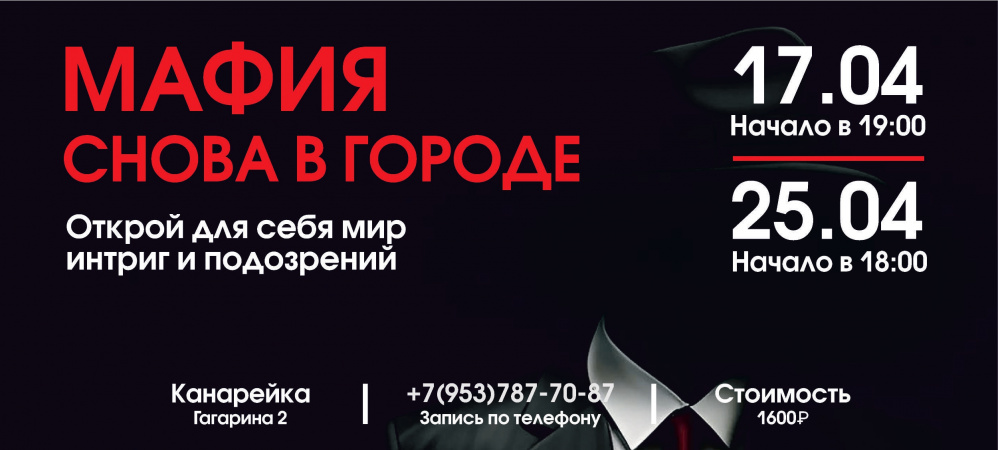 Мафия снова в городе. Кто ты сегодня — мирный житель или хладнокровный босс? Ложь, психология и победа любой ценой. Успей занять место за столом интриг. 17.04 (19:00) | 25.04 (18:00) «Канарейка», Гагарина 2 1600₽ | Запись по телефону в шапке профиля +79537877087
