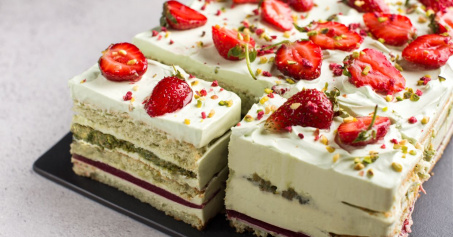 миндально-фисташковый бисквит, фисташковый крем ана основе сыра Маскарпоне, малиновый мармелад и фисташковое пралине